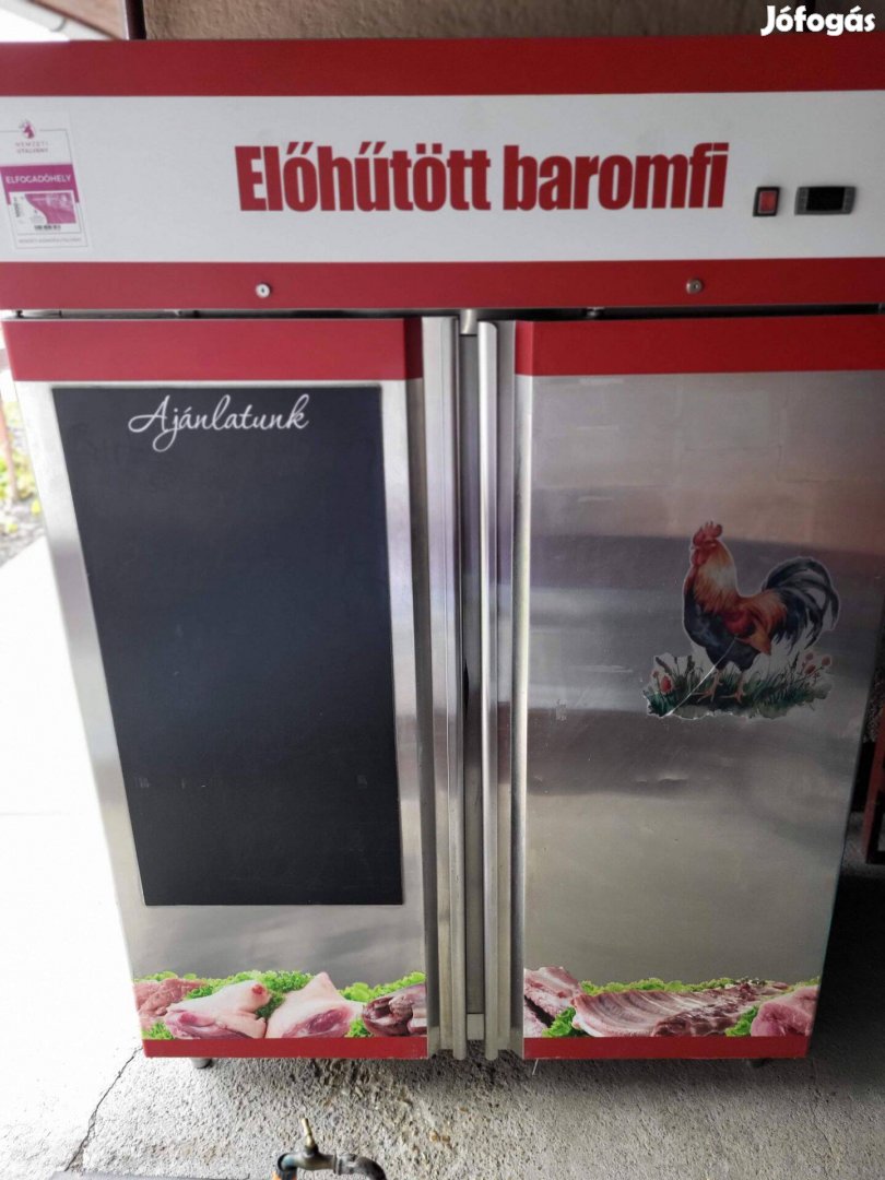 1400l.-es inox kétajtós háttérhűtő. A hűtése kitűnő, 0, +2 C on működött, előhűtött husok tárolására volt használva. Az ajtók gumigléderei sérültek folyamatosan szervizelve volt akár 27 db M-10 es rekeszt elbir. Típuscsere miatt eladó.
