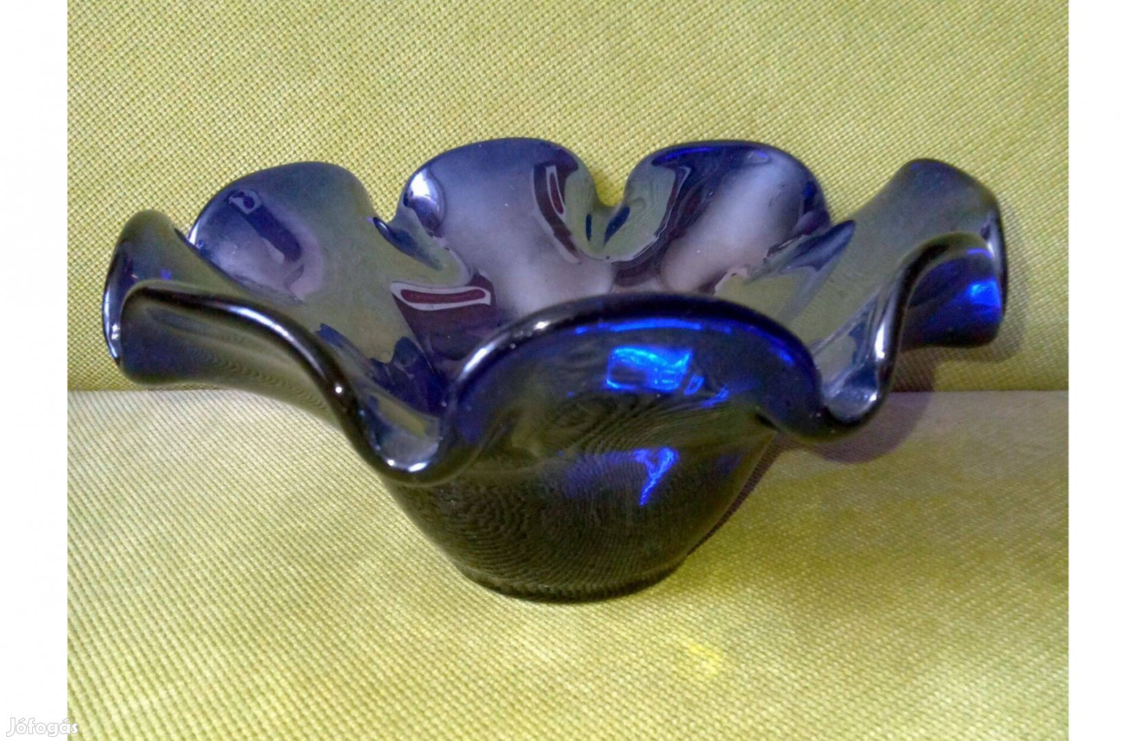 Irizáló, fodros szélű kék üveg asztalközép, kínáló