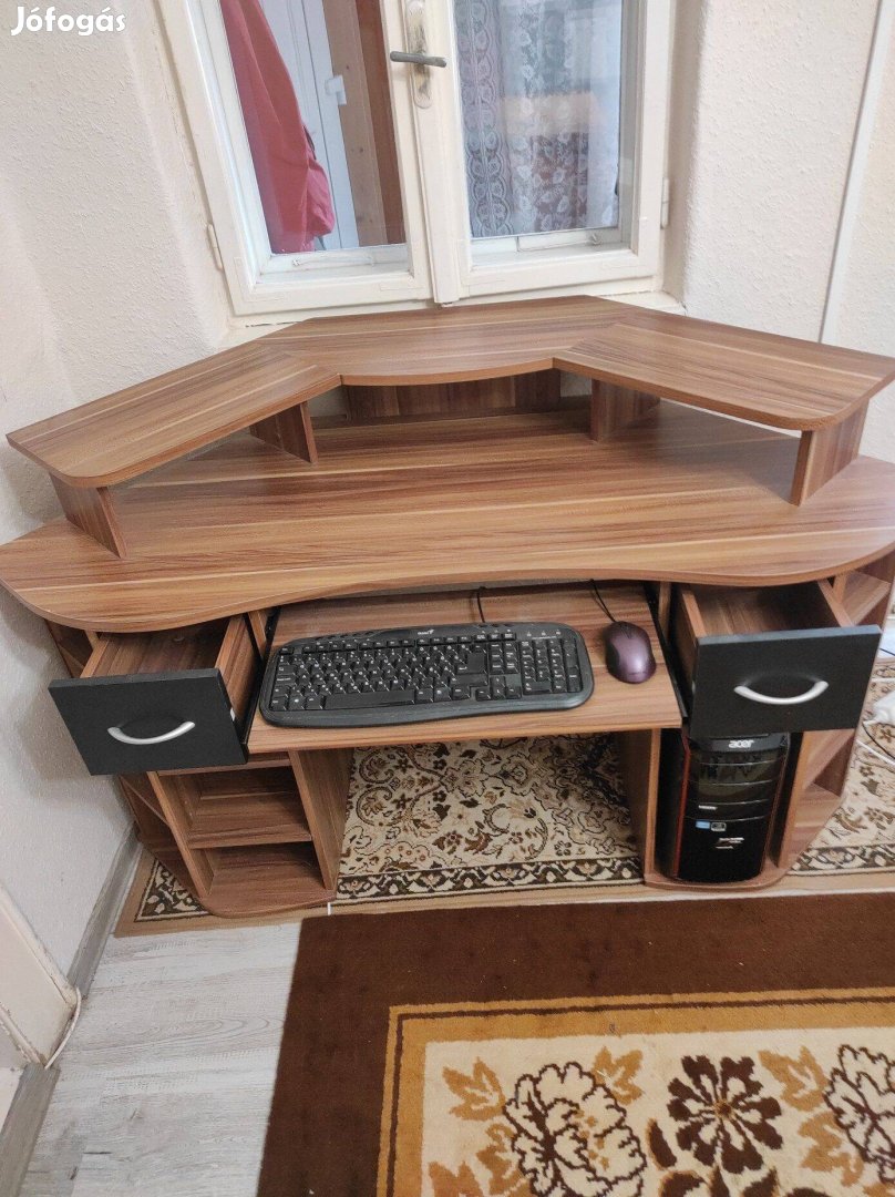 Eladó a képeken látható íróasztal, monitor- és billentyűzet tartóval. Kisebb sérülések vannak rajta, de jó állapotú. Debrecenben házhoz szállításban tudok segíteni.