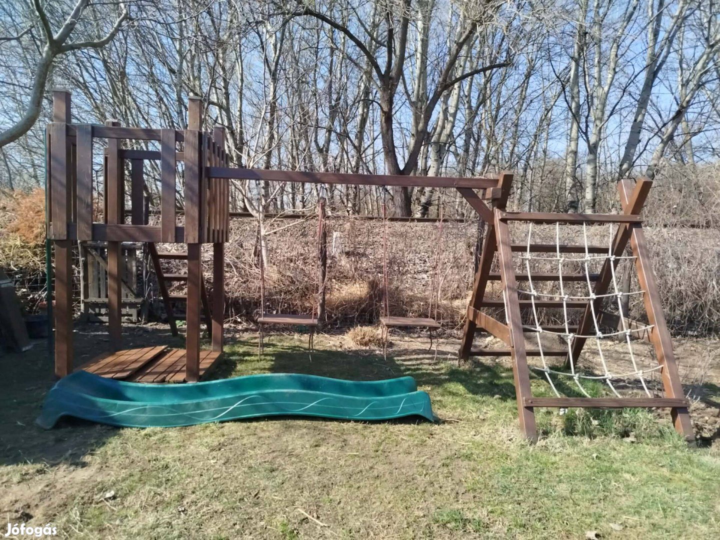 "Játszótér" eladó: 5,6 m x 2 m + létra. Frissen festve . 2 hinta, torony, homokozó, csúszda (az egyik lefogatónál törött, a használatát nem befolyásolja, műanyaghegesztővel teljesértékűvé tehető). A játék nagy része telített fából készült!