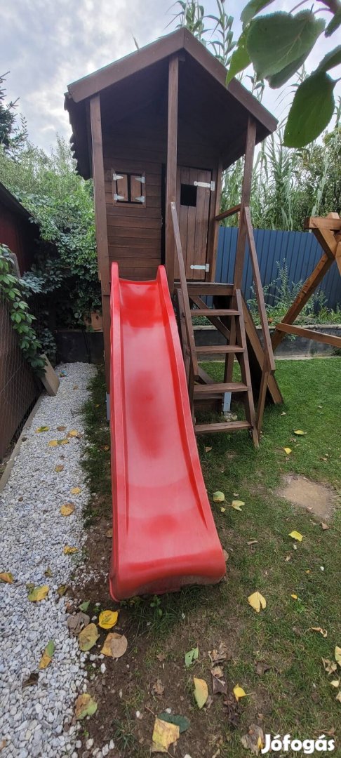 Kihasználatlanság miatt eladó kerti fa játszóház,csúszdával,mászófallal a képen látható állapotban.