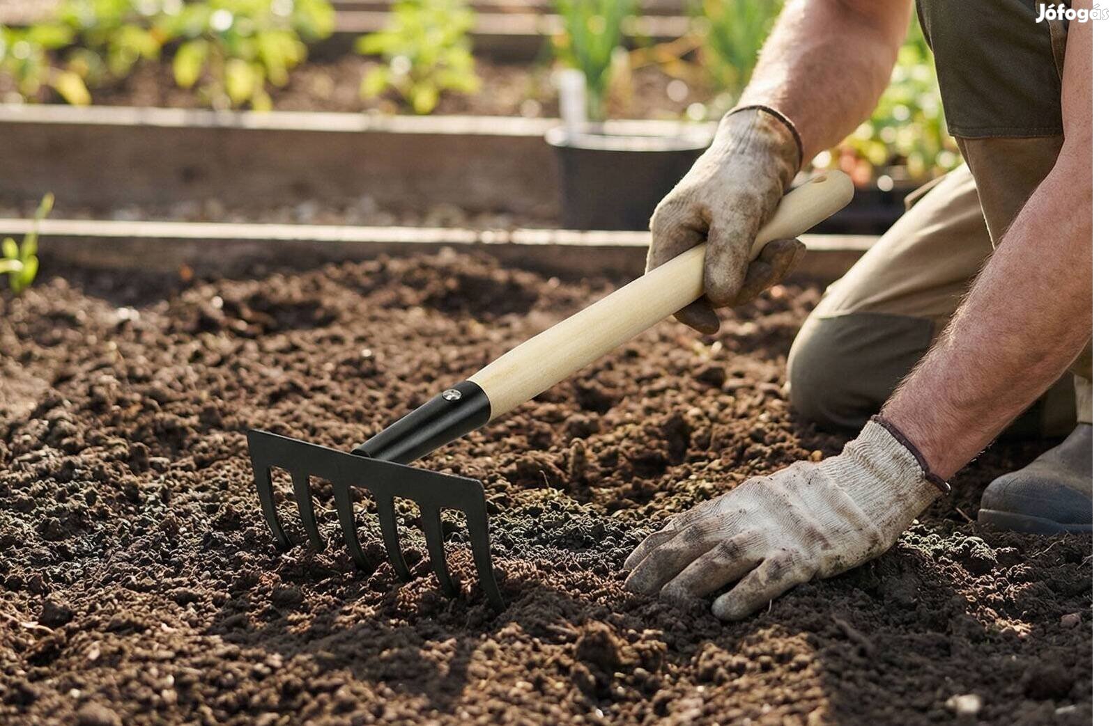 Kerti szerszám kézi gereblye fém fej 50 cm fa nyéllel virágágyás zöldségágyás 11.295.e