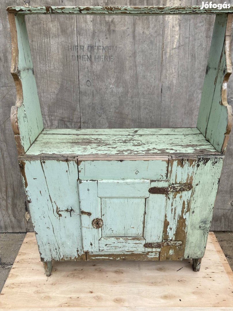 Antik darab, rusztikus kerti tároló. Fedett teraszon hal-és madáreleséget tároltunk benne.