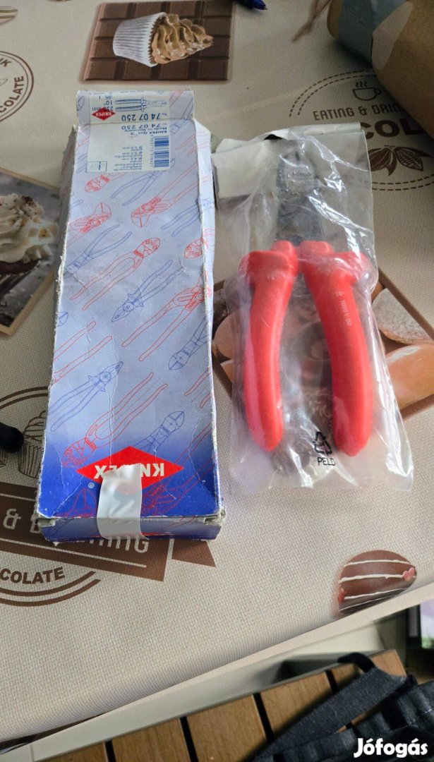 Főleg debreceni átvétel. Ez egy Knipex márkájú, professzionális erő-oldalcsípő fogó (modell: 74 07 250), amely a szerszámok világában a prémium kategóriát képviseli. A Knipex egy világszerte elismert német márka, amely a legjobb minőségű fogókat gyártja.Jellemzők:Nagy igénybevételű vágás: Ezt a típust (High Leverage) úgy tervezték, hogy 20%-kal kevesebb erőkifejtés kelljen a vágáshoz a hagyományos oldalcsípőkhöz képest.Vastag huzalokhoz: Alkalmas zongorahuzal, kemény és lágy huzalok vágására is.Biztonság: A piros-sárga (VDE) szigetelt markolat védelmet nyújt 1000 V-ig, így villanyszerelők számára is alapműszer.Mérete: Ez a 250 mm-es változat a sorozat egyik legnagyobb és legerősebb darabja.