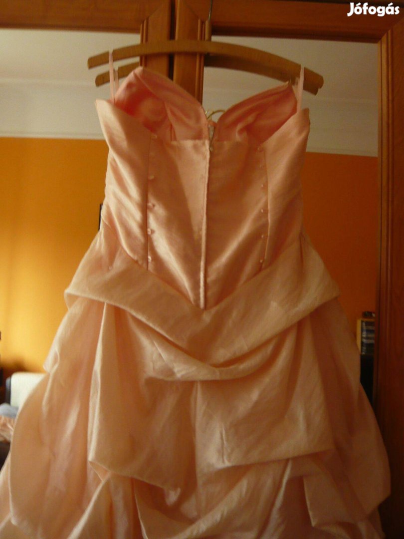 Eladó a képen látható egyszer használt 48 as méretű barackvirág színű alkalmi ruha ,eljegyzésre, esküvőre, koszorúslánynak , boleróval, nyakdísszel. Háta fűzős méretre igazítható.