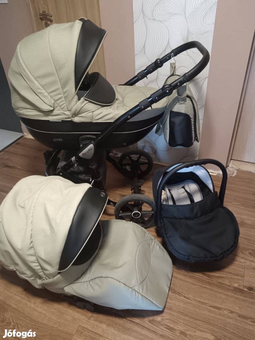 Eladó Kunert Mila babakocsi, nagyon szép állapotban, a vázon használatból eredő karcok vannak. Pelenkázó táska, szúnyog háló, és eső védővel.