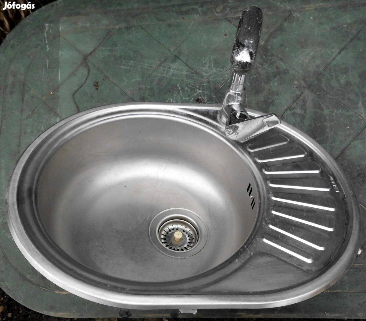 Livinox rozsdamentes acél mosogató, csappal. Használt, de szép állapotban, a kép szerint. Méret a képen. A túlfolyó műanyag csövét cserélni kell.