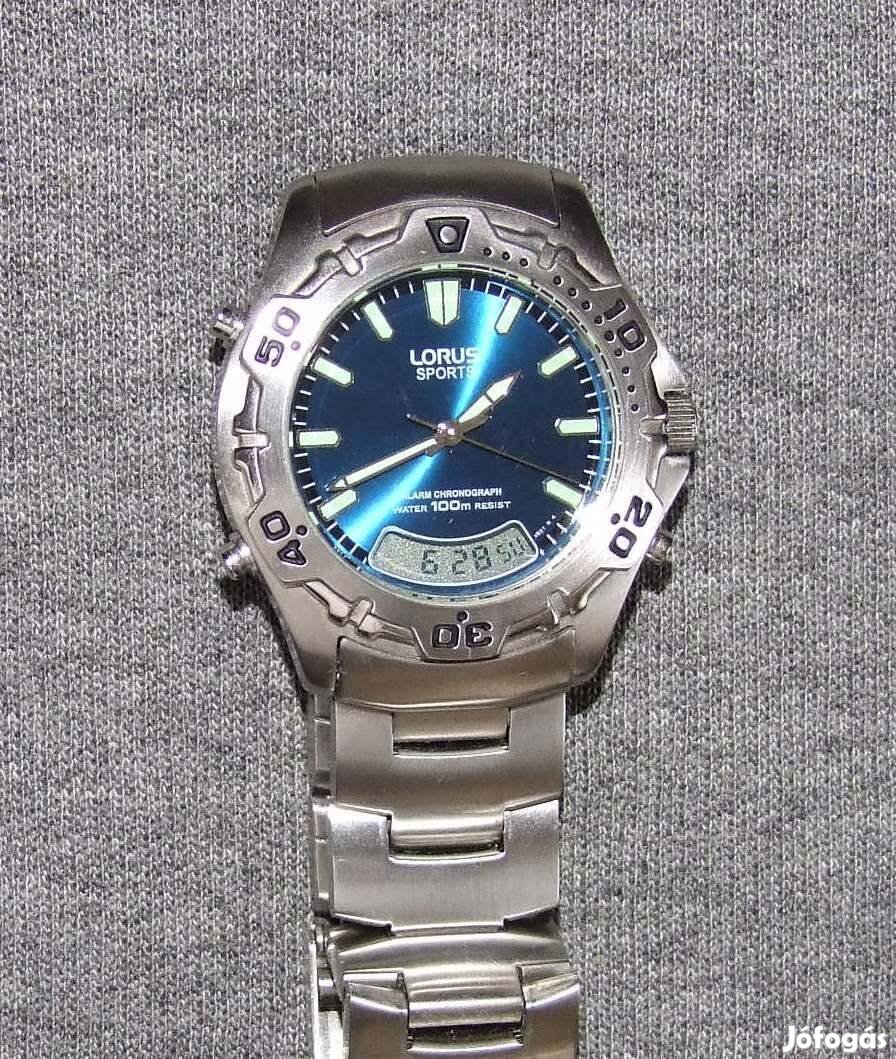 Eladó Lorus V71-X014 analóg-digitális karóra, szép, megkímélt, újszerű állapotban. Gyönyörű azúrkék számlap, zöld foszforeszkáló mutatók, osztások.