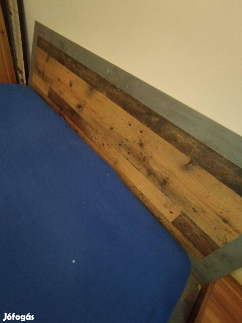 A rácsokból egy hiányzik, ágy végi lábainál a ragasztott fedő réteg kis helyen feljött.
