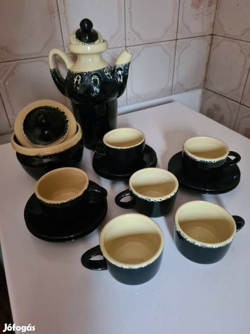 Eladó a képeken látható mázas kerámia kávés készlet kiöntővel, cukor tartóval, 6 db csészével és a hozzájuk tartozó csészealjakkal, új, sosem használt állapotban.