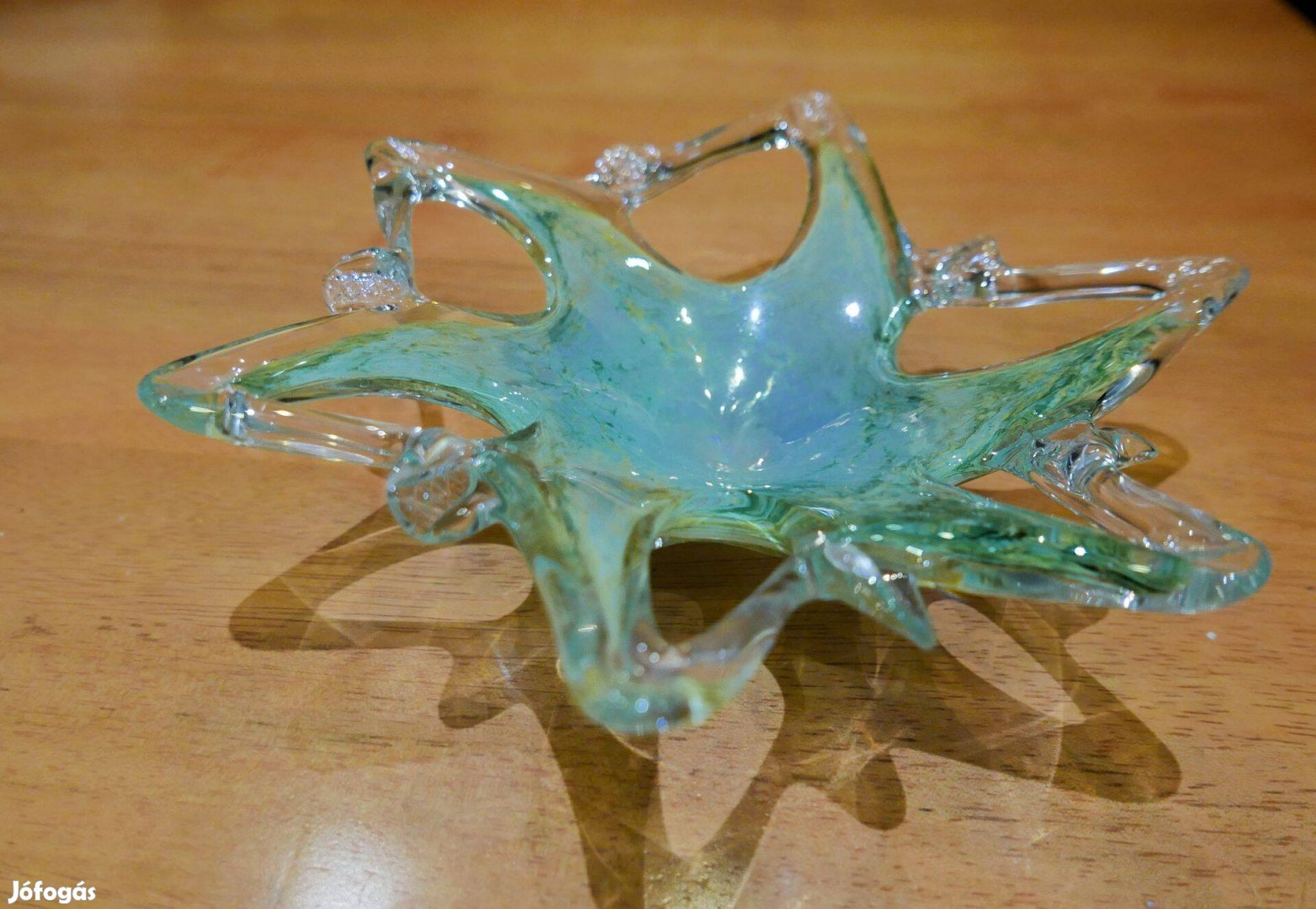 Eladó egy új, eddig vitrinben tárolt muránói hutaüvegből kézzel készített díszes tál. Átmérője: 23 cm, magassága 7 cm, súlya 490 g. Személyes átvétel ajánlott Debrecenben, (esetleg Budapesten).