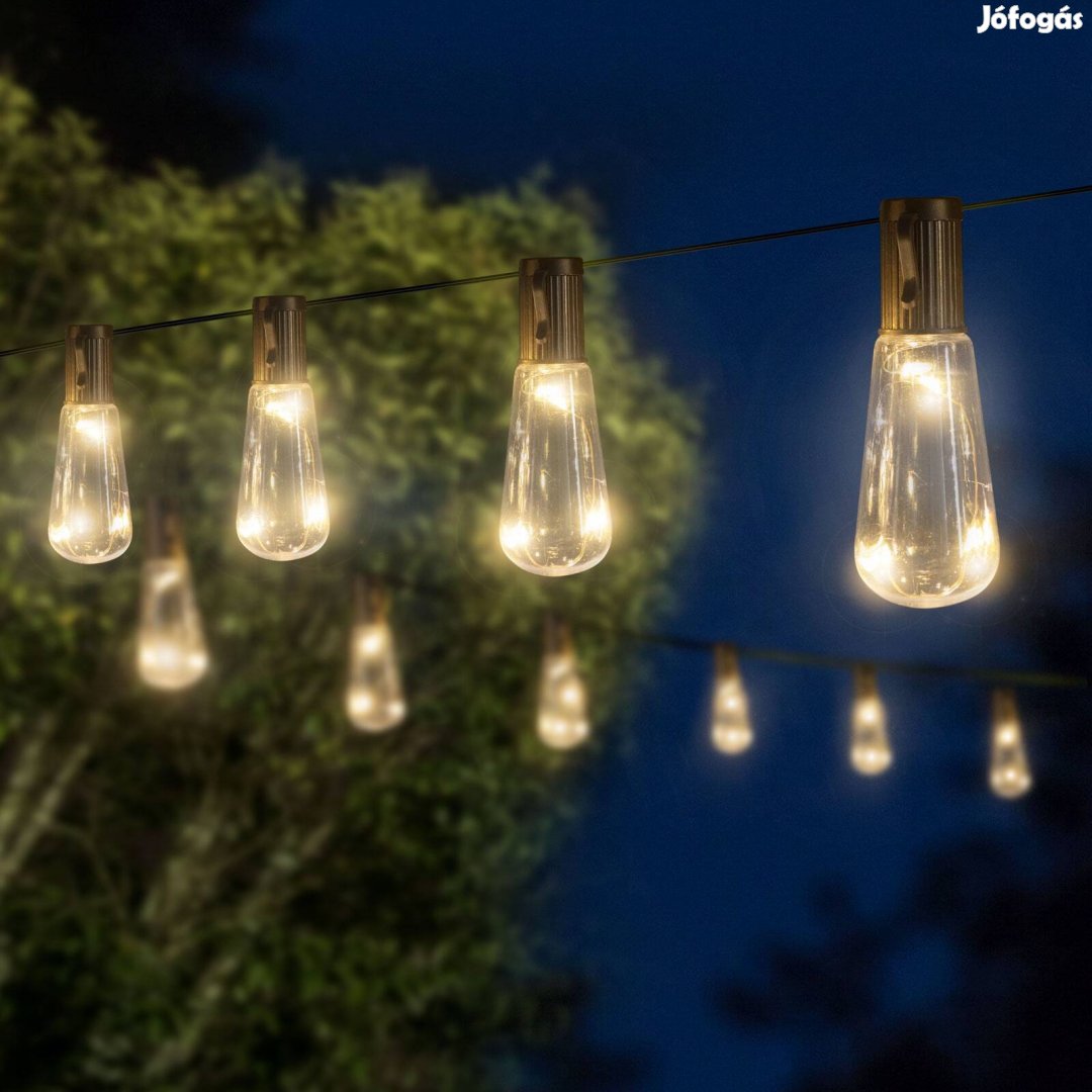 energiahatékony, szolár fényfüzérrel! A hagyományos villanykörtére hasonlító fényfüzér mikro-LED-eket tartalmaz, amely jól mutat bármely kerthelyiségben. Kiváló választás egy nyári, meghitt, kerti vacsorához, de ideális választás lehet nyüzsgő kertipartikhoz is. Minden fényfüzér 3 db melegfehér LED-et tartalmaz. Az izzók akasztófülekkel, míg a szolár panel leszúrótüskével rendelkezik, így egyszerűen rögzíthetőek bárhová.