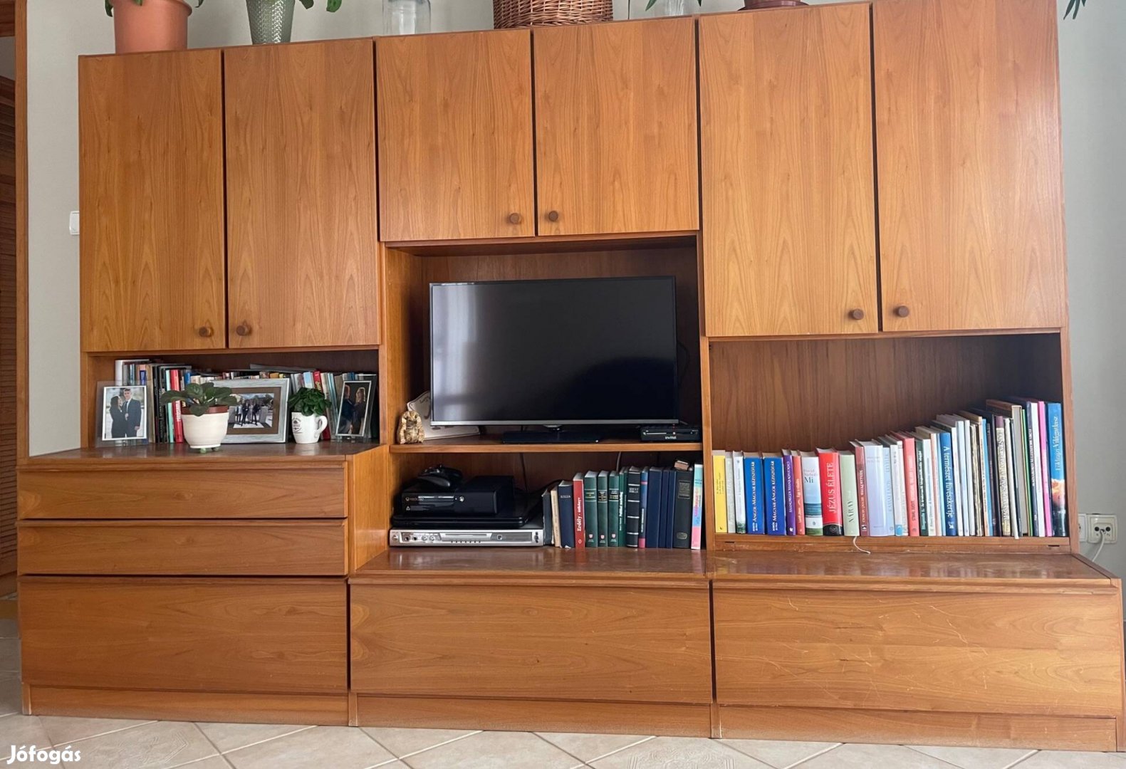 Megkímélt, stabil állapotú szekrénysor, sok polcos tárolási lehetőség, nagy fiókokkal.