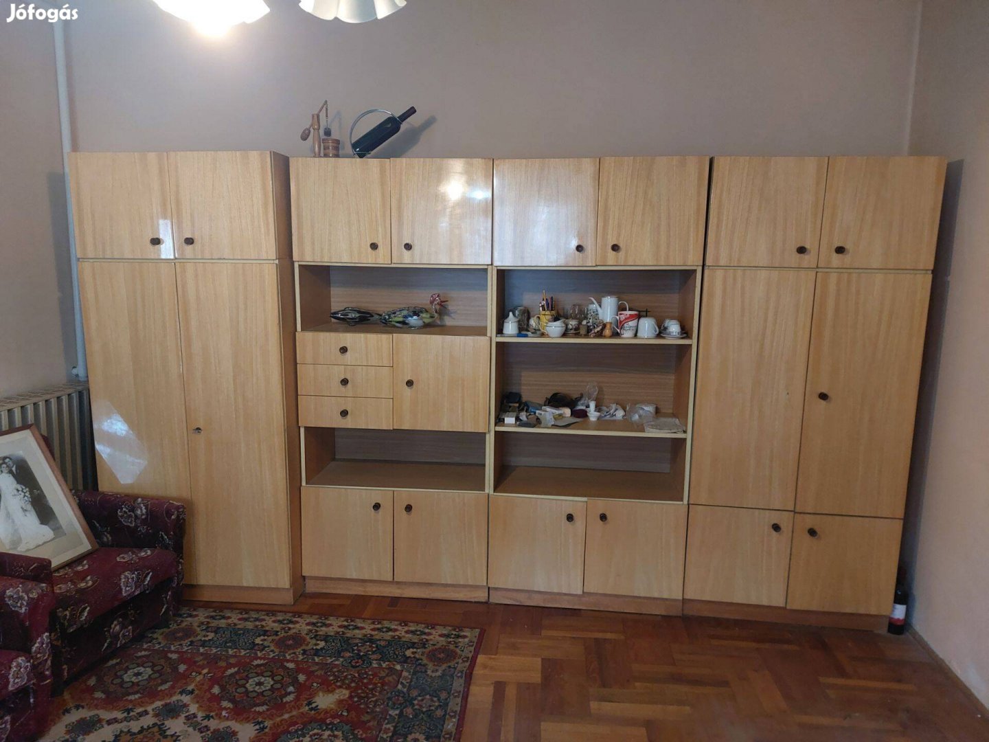 Leírás: Kiterjedt tárolókapacitással rendelkező, világos fahatású nappali szekrénysor. Az együttes négy fő vertikális egységből áll, amelyek zárt akasztós szekrényeket, fiókokat, valamint nyitott vitrines felületeket is magukba foglalnak.