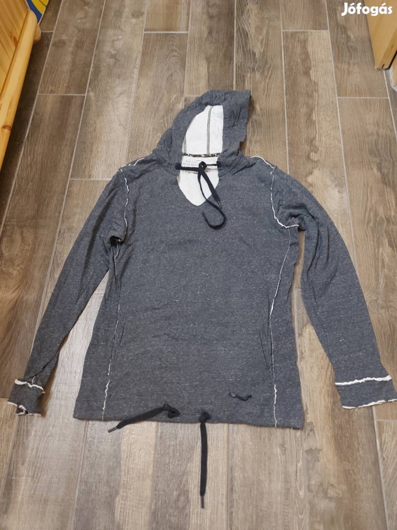 Eladó a képen látható jó állapotban lévő női L es méretű, pamut anyagból készült, kapucnis, zsebes, szürke színű babos mintás, alul állítható, sportos pulóver.
