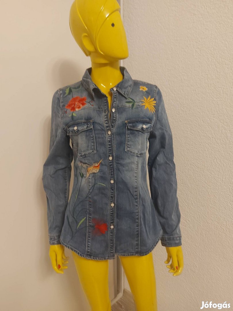 Eladó a képen látható újszerű állapotban lévő női L es méretű, kissé elasztikus farmer anyagból készült, hímzett, koptatott, gombos karcsúsított, hosszú újjú ing.