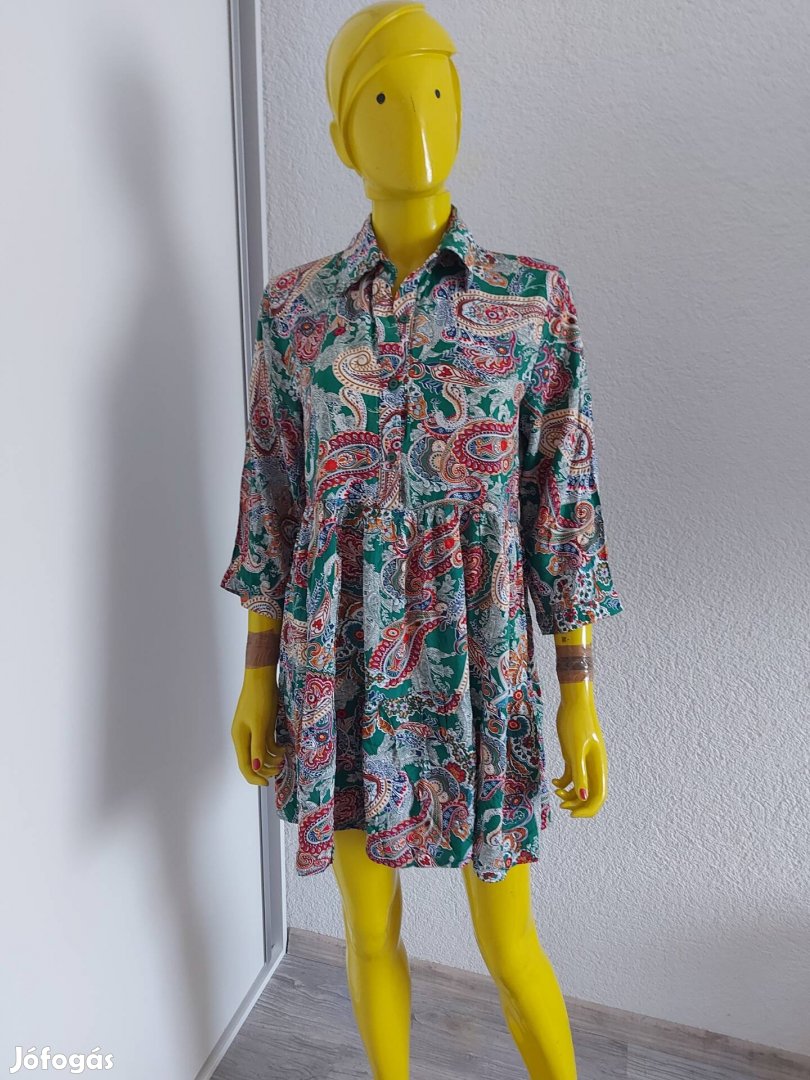 Eladó a képen látható jó állapotban lévő női M-L es méretű, színes mintás, galléros, flokonos anyagból készült, fodros,háromnegyedes újjú ami felgombolható, tunika jellegű felső.