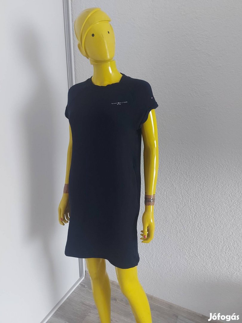 Eladó a képen látható jó állapotban lévő női XS es méretű, sötét kék színű, pamut anyagból készült, rövid újjú, kerek nyakú, zsebes, minőségi ruha.