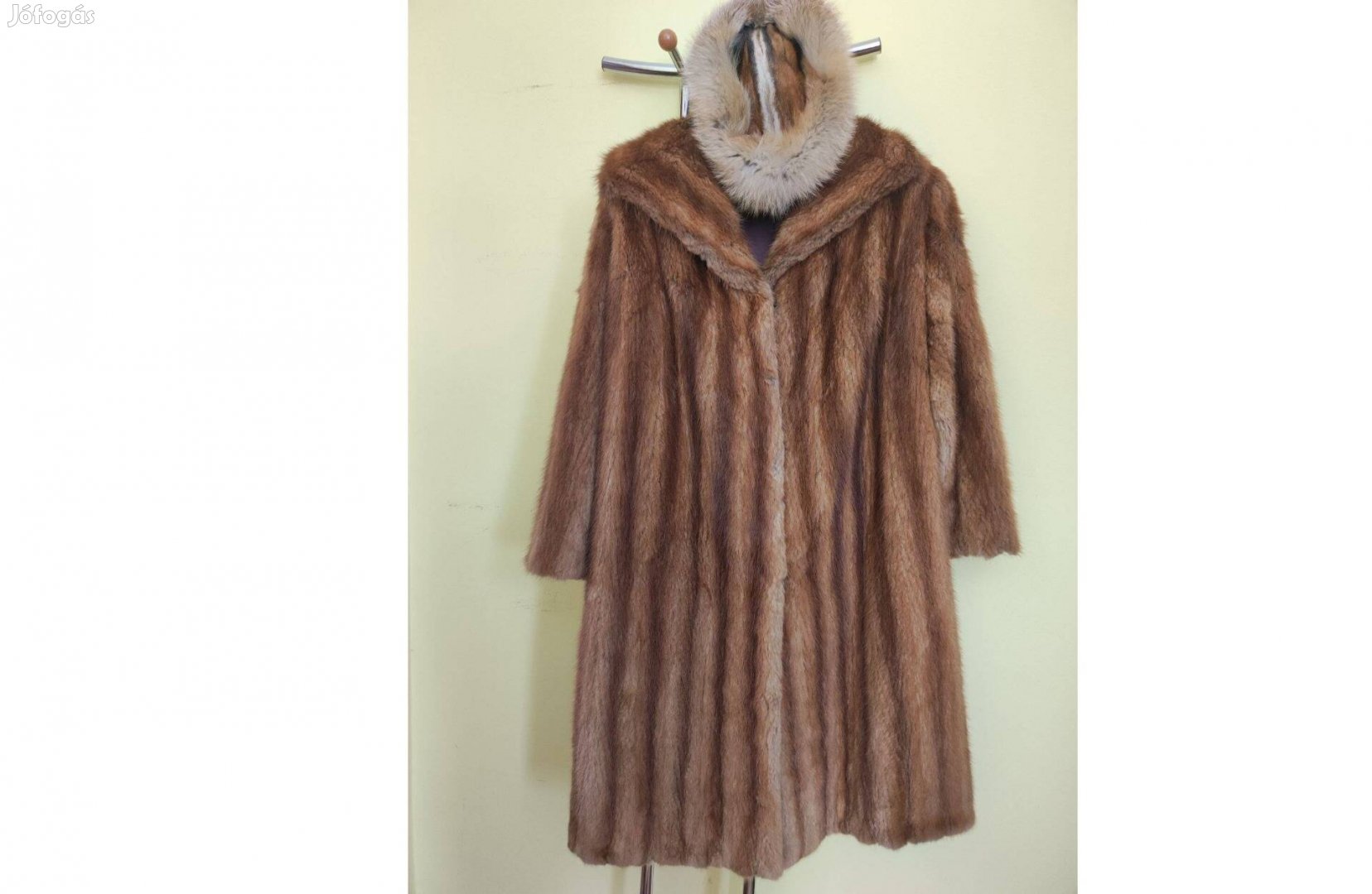 Megrendelésre gyártott pézsma bundakabát sapkával, egyedi vállfával eladó