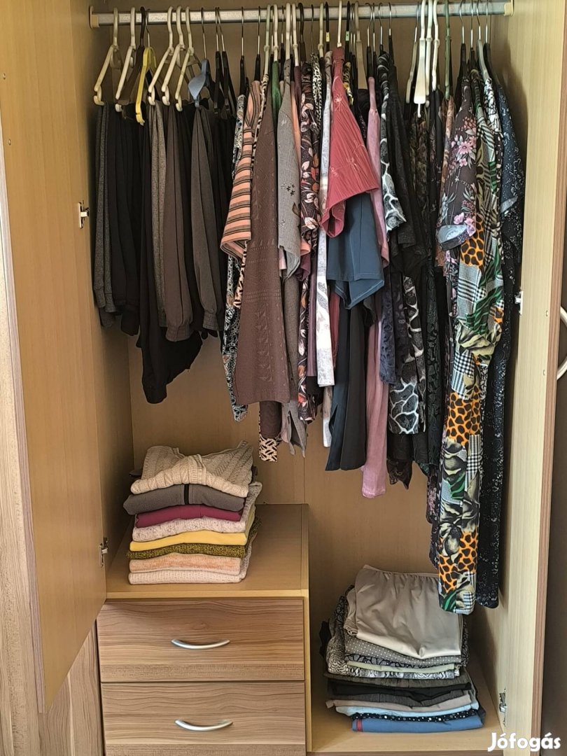 A ruhák tiszták, vasaltak. Egy részük alkalmi. Van közöttük új, alig használt. Vállfán tároltak és vállfálval együtt vihetők.