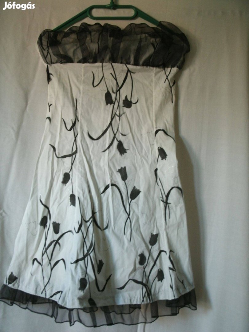 Pánt nélküli mellnél gumis S ruha. Fehér alapon fekete mintás