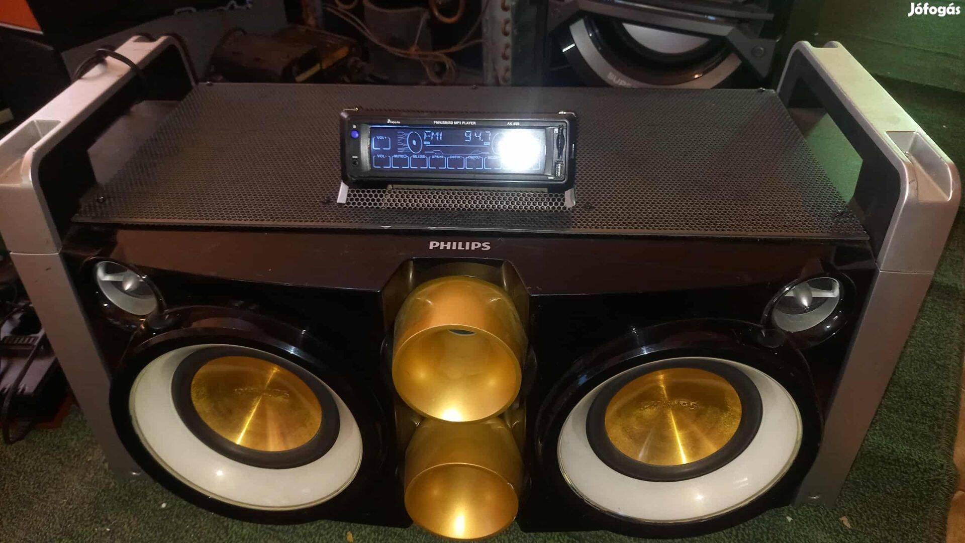 Használt, de tökéletesen működő Philips Fwp3200D rendszer, ideális bulikba és otthoni környezetbe a 300 W RMS teljesítménynek és a zene ütemét követő dinamikus fényeffektusoknak köszönhetően. Eredeti távirányító és tápkábel tartozék; AUX/Bluetooth átalakító is tartozik hozzá, amellyel okostelefonokat, táblagépeket vagy PC-ket vezeték nélkül csatlakoztathat a 3,5 mm-es AUX/MP3 Link jack csatlakozóhoz. ""Party machine"" kialakítás kettős forgatható 30 tűs iphone/ipod dokkolóval, crossfaderrel és DJ stílusú vezérlőkkel a lejátszási listák keveréséhez az opcionális djay alkalmazással. ### Főbb jellemzők - Hangteljesítmény: Összesen 300 W RMS Max Sound technológiával és digitális hangszabályozással a basszus és a hangprofilok kiemeléséhez. - Világítás: Dinamikus, időben pulzáló fények, amelyek kikapcsolhatók, ha nincs rájuk szükség. - Bemenetek: USB Direct MP3-hoz, MP3 Link/AUX 3,5 mm-es elöl, kettős mikrofon bemenet karaoke-hoz hangerő- és visszhangszabályzóval, 3,5 mm-es fejhallgató kimenet. - FM rádió digitális hangolással és előre beállított állomásmemóriákkal. - DJ vezérlők: kettős forgó dokkoló iphone/ipod lejátszásához és töltéséhez, csatornafader az eszközök közötti váltáshoz, djay alkalmazás támogatás. - Hozzávetőleges készülékméretek: kb. 704 x 364 x 385 mm; könnyű pozicionálás az integrált fogantyúknak köszönhetően. ### Felszereltség és állapot - Tartozék: Fwp3200D egység, Philips távirányító, tápkábel, további AUX/Bluetooth adapter vezeték nélküli audio streaminghez. Állapot: Használt, normál esztétikai kopással, de tesztelt és teljesen működőképes. Tökéletes azok számára, akik egyetlen rendszerben keresnek hangerő-, basszus- és DJ funkciókat, a mellékelt adapteren"