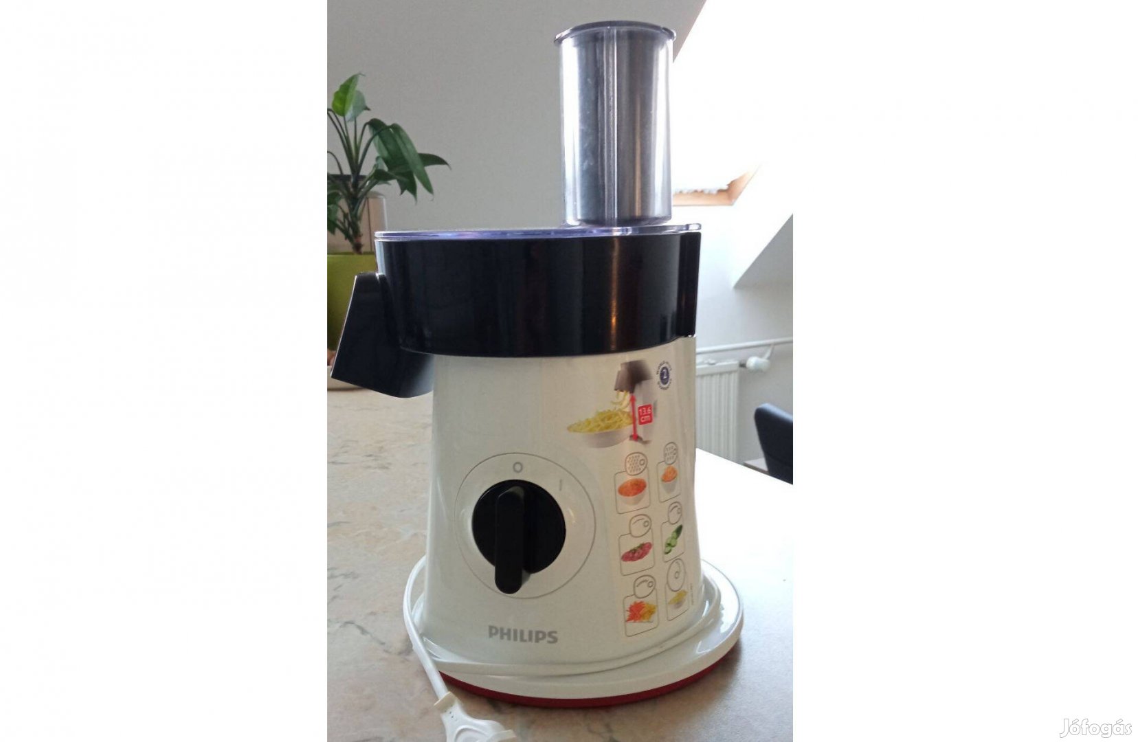 Néhányszor használt aprító. Teljesítmény: 200 W. 5 db különböző méretű aprítótárcsája van, plusz 1 nagy "XL julienne" tárcsa hasábburgonyához. Garanciája már lejárt. Használati utasítása megvan.