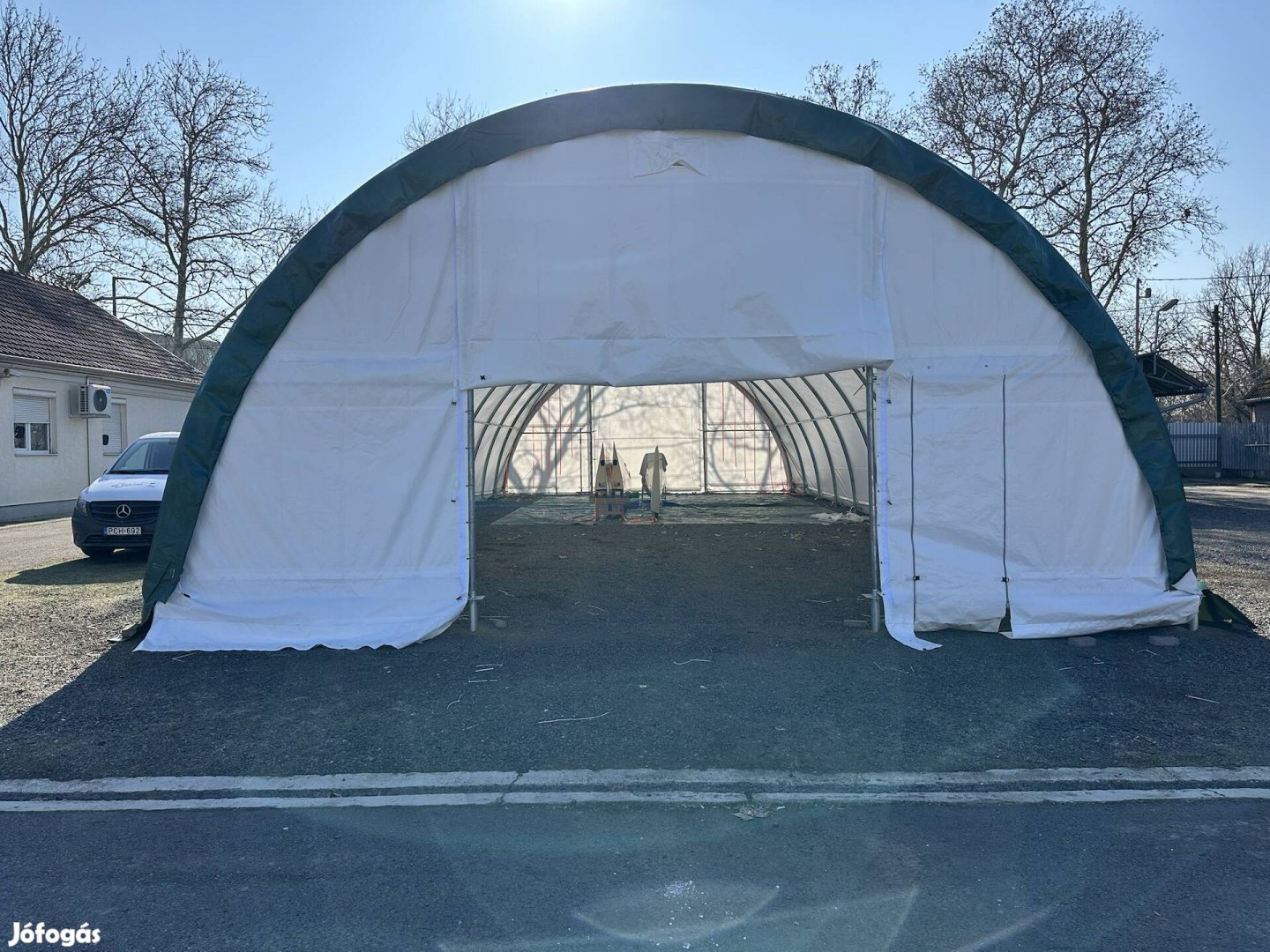 Új ponyva sátor eladó. A képeken egy már megépített sátor látható, eladásra új sátrat kínálok, a képeken is látható dobozban. Méretei: (sz x h x m) 9m x 20m x 4.5m. Több darab elérhető.