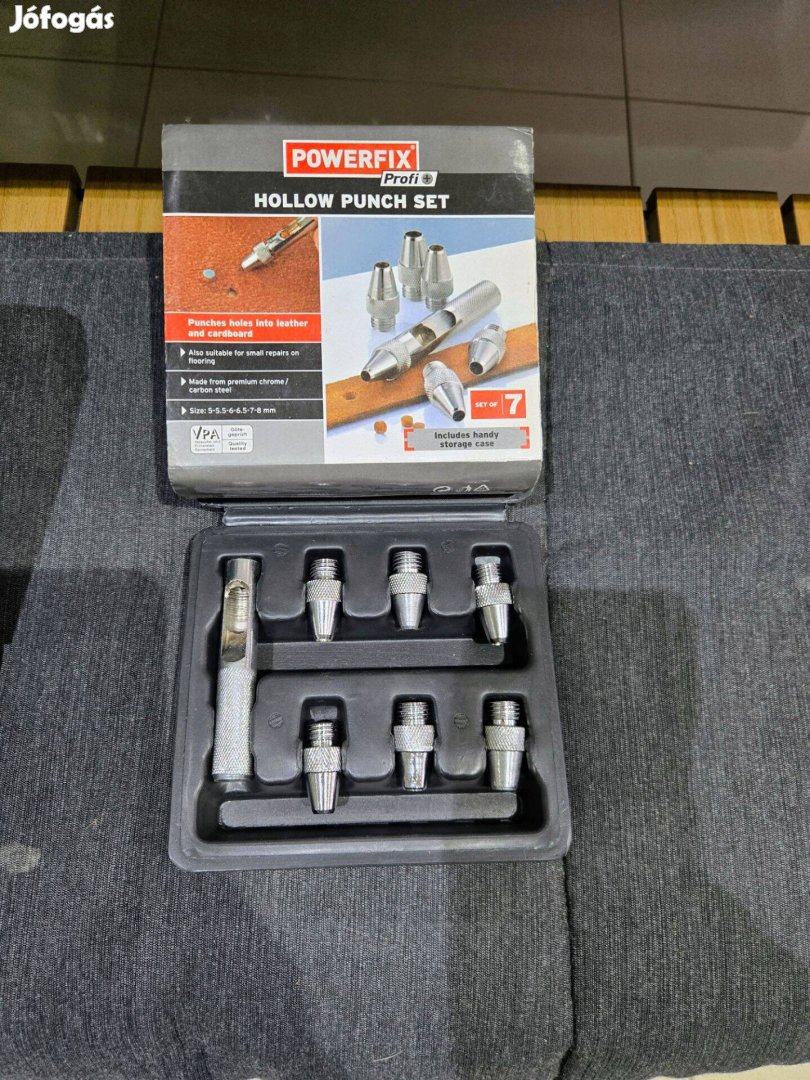Debreceni átvétel, de ha kell postázom. Ez egy Powerfix Profi+ lyukasztó készlet (Hollow Punch Set). Ez a szerszám kiegészíti a korábban küldött asztalos és lakatos készleteidet, de ez inkább a bőrdíszműves vagy kárpitos munkákhoz való.Mit tud?Funkció: Lyukak vágására szolgál puha anyagokba, mint például bőr, gumi, karton, vászon vagy parafa.Működése: A kiválasztott méretű fejet bele kell csavarni a recézett tartónyélbe, majd egy kalapáccsal ráütni a nyél végére. A éles peremű fej ekkor egy tiszta, kör alakú lyukat vág az anyagba.Méretek: 7 darabos készlet, a következő átmérőkkel: 5; 5,5; 6; 6,5; 7; 8 mm.Anyag: Prémium króm-szénacélból készült a tartósság érdekében.Tárolás: Praktikus műanyag dobozban van, ami megvédi az éleket a kicsorbulástól.