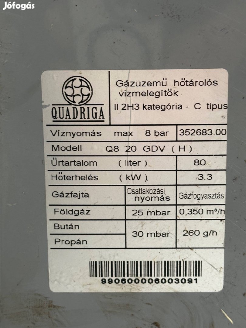 Eladó használt , de működő Quadriga 80 literes gáz bojler kedvezményes áron.