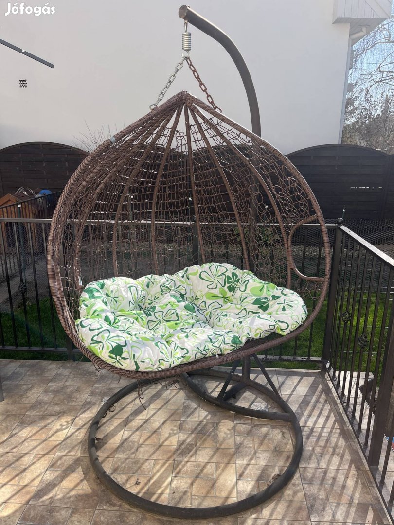 Eladó egy rattan hatású függőfotel váz. A váz stabil, de a fonás nagy része szétment vagy hiányzik, így felújításra szorul.