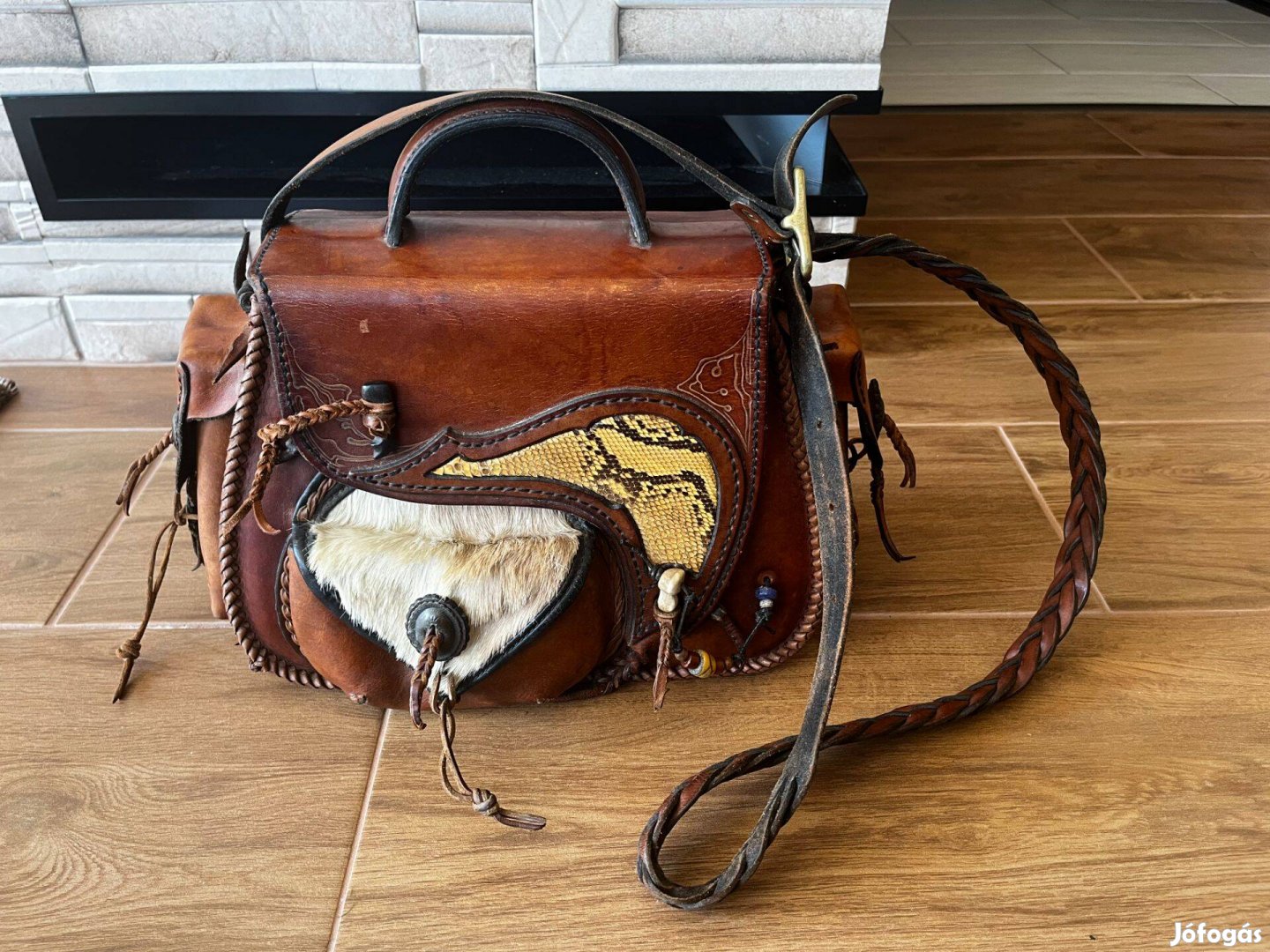 Eladó a képen látható régi pásztor tarisznya. A táska gyönyörű, kézzel készített népművészeti bőrdíszbűves alkotás, mely állati szörme, és kígyóbőr berákással készült. Az alkotó mesterjele a táska hátulján látható, ezidáig nem sikerült beazonosítani.