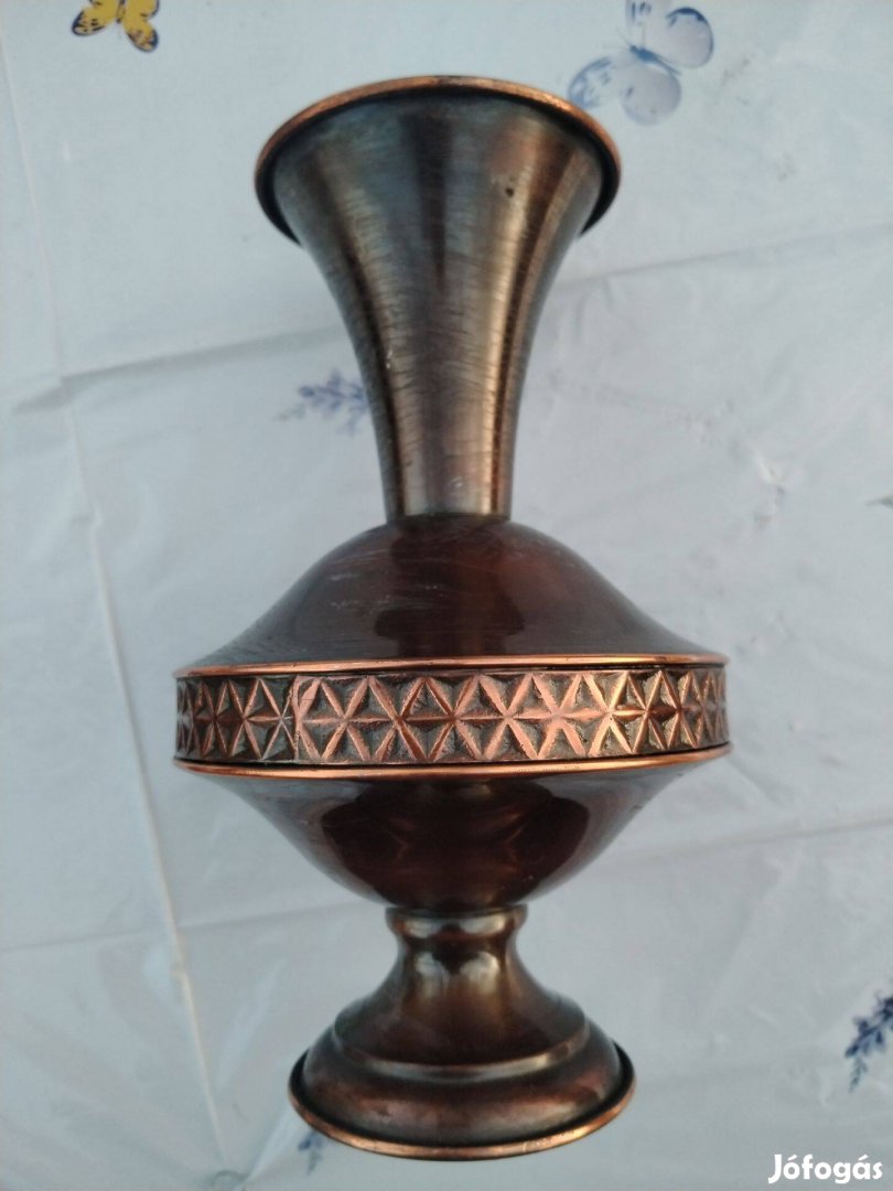 A 20. század második feléből származó, dombornyomott mintázatú bronz váza szép állapotban eladó. Magassága: 21 cm. Szélessége a dombornyomott résznél 12 cm.