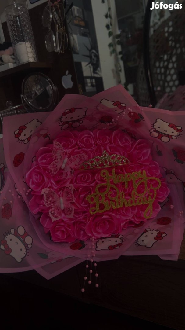 Kézzel készített szatén örök rózsa csokor. 59szálas pink, rany korona, szülinapos felirat, feher pillangó, hello kitty csomagolo papir.