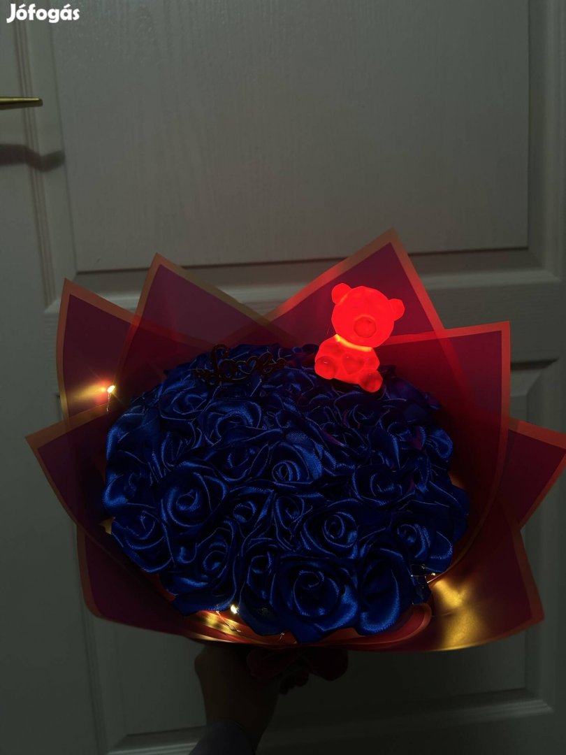 Kézzel készült szaténból. 50szálas kék,love felirat,világítós maci.