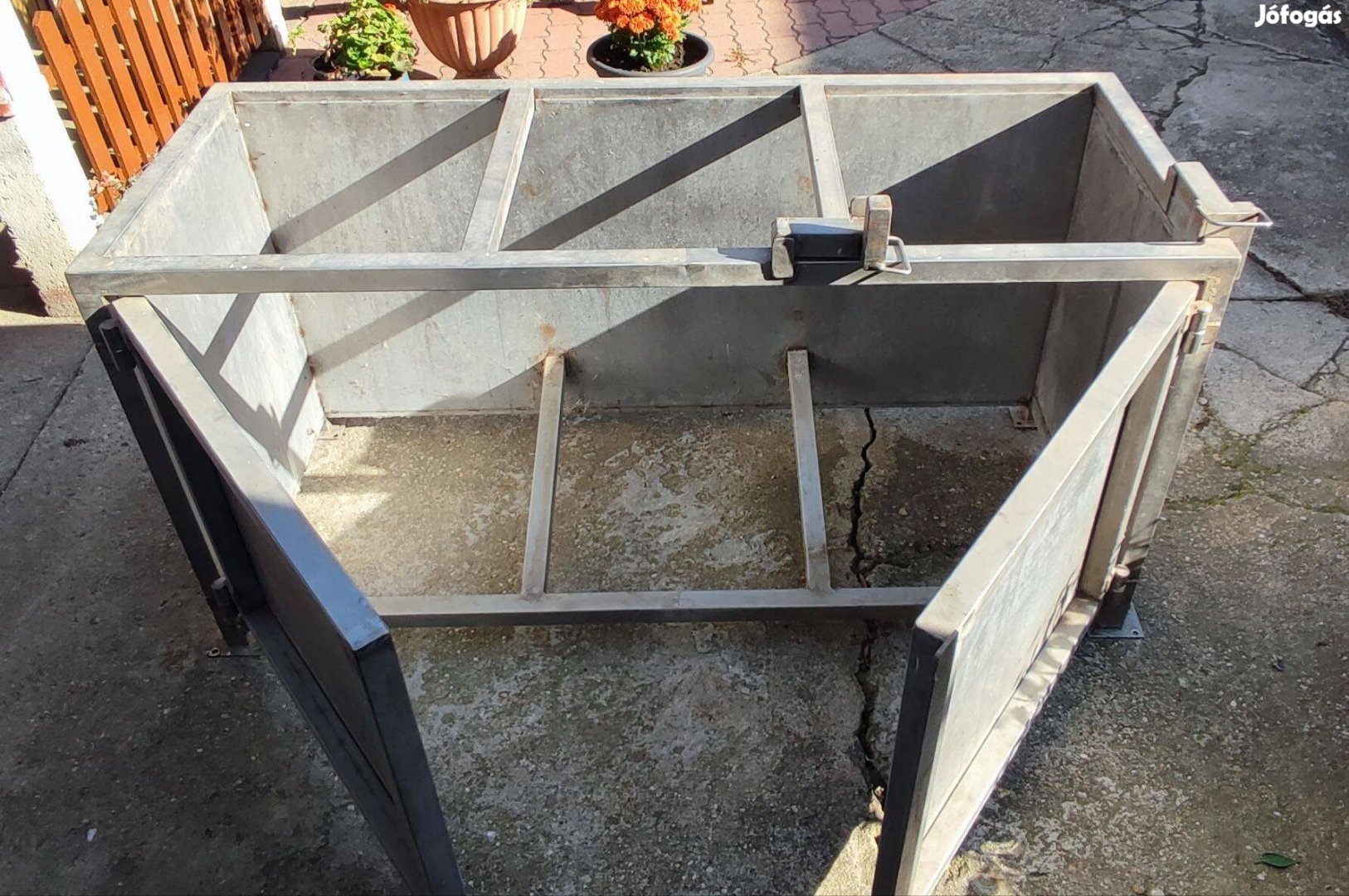 Eladó egy rozsdamentes acél sertés rögzítő kaloda jó műszaki állapotban.