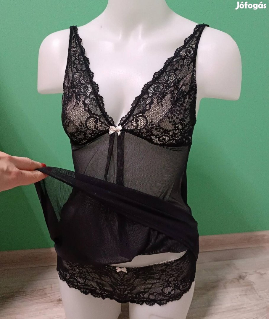 Hibátlan állapotú babydoll + alsó. Címke nincsen már rajta, de újszerű állapotú. Méret jelölés nincsen rajta, de kb. S-M méret. Kisebb mell méretre ajánlom inkább.