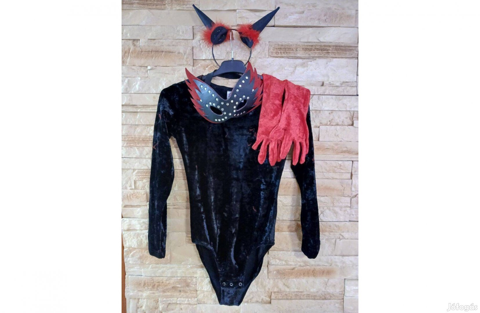 S-es fekete bársony body ördög jelmez, kesztyűvel, álarccal, fejpánttal újszerű állapotú.