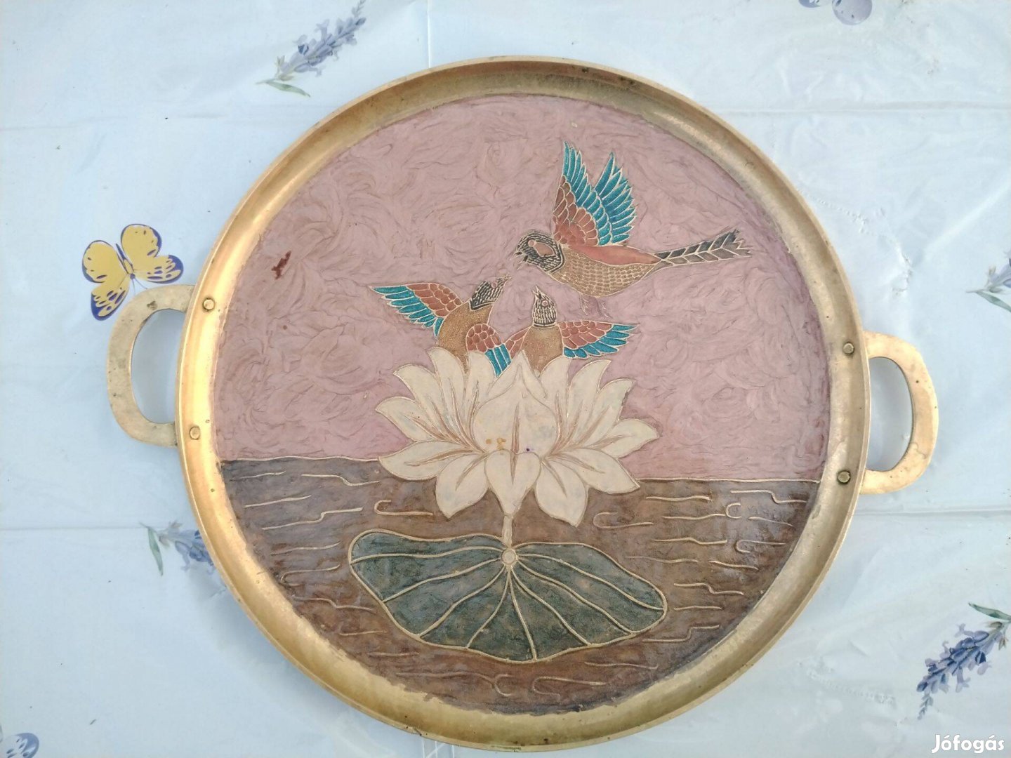 Sárgaréz tálca tűzzománc diszítéssel