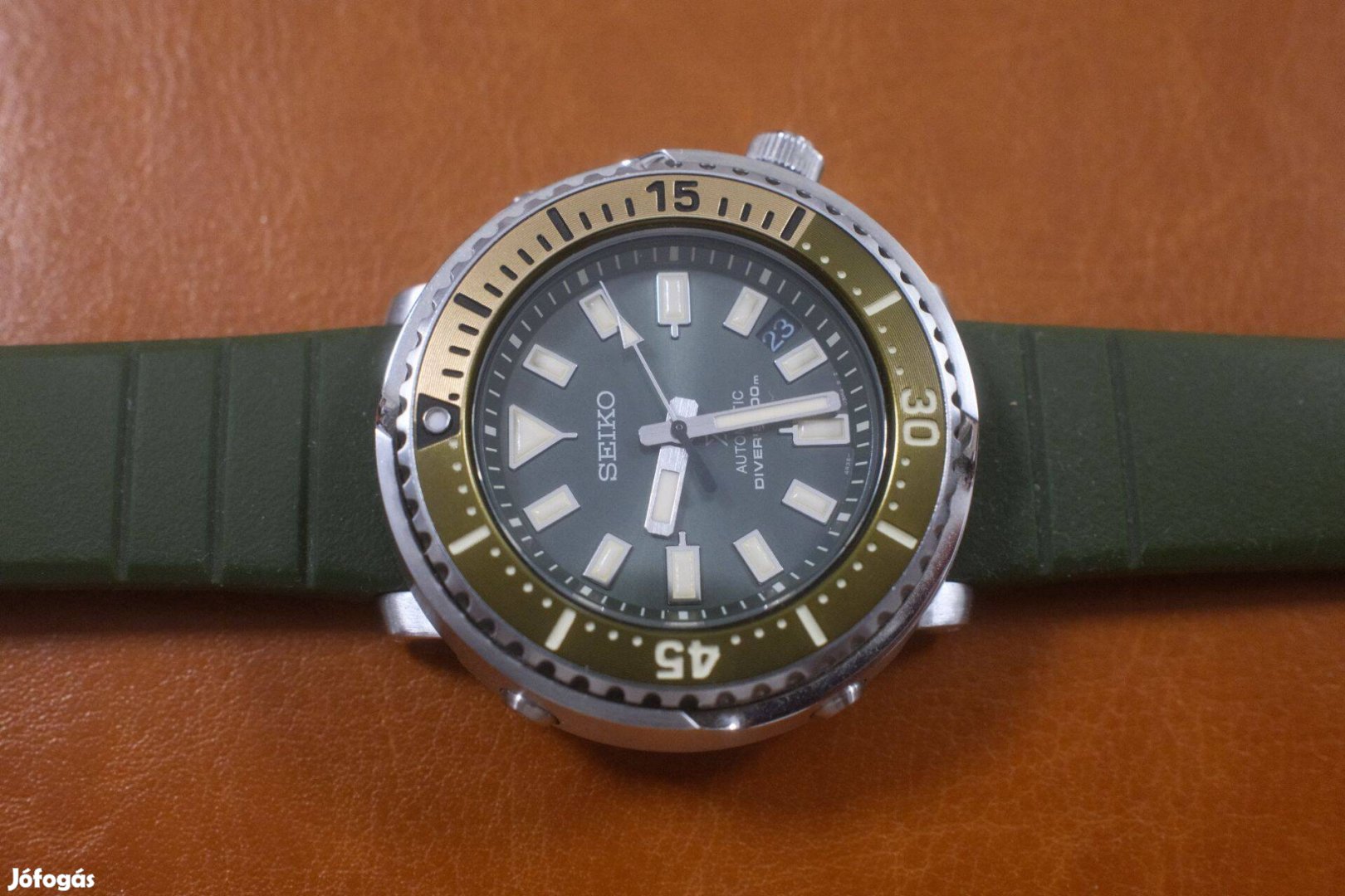 Eladó a címben jelzett Seiko automata férfi óra, újszerű állapotban. Hardlex üveg, szilikon-kaucsuk szíj, 4R35 kaliber, kézzel is húzható szerkezet, 200 méterig vízálló. Az óratok átmérője 43 cm. Pár alkalommal volt a kezemen, úgyhogy teljesen karcmentes az üveg és a tok is, a szíja nem repedt, nincs elszíneződve. Minden tekintetben hibátlan.