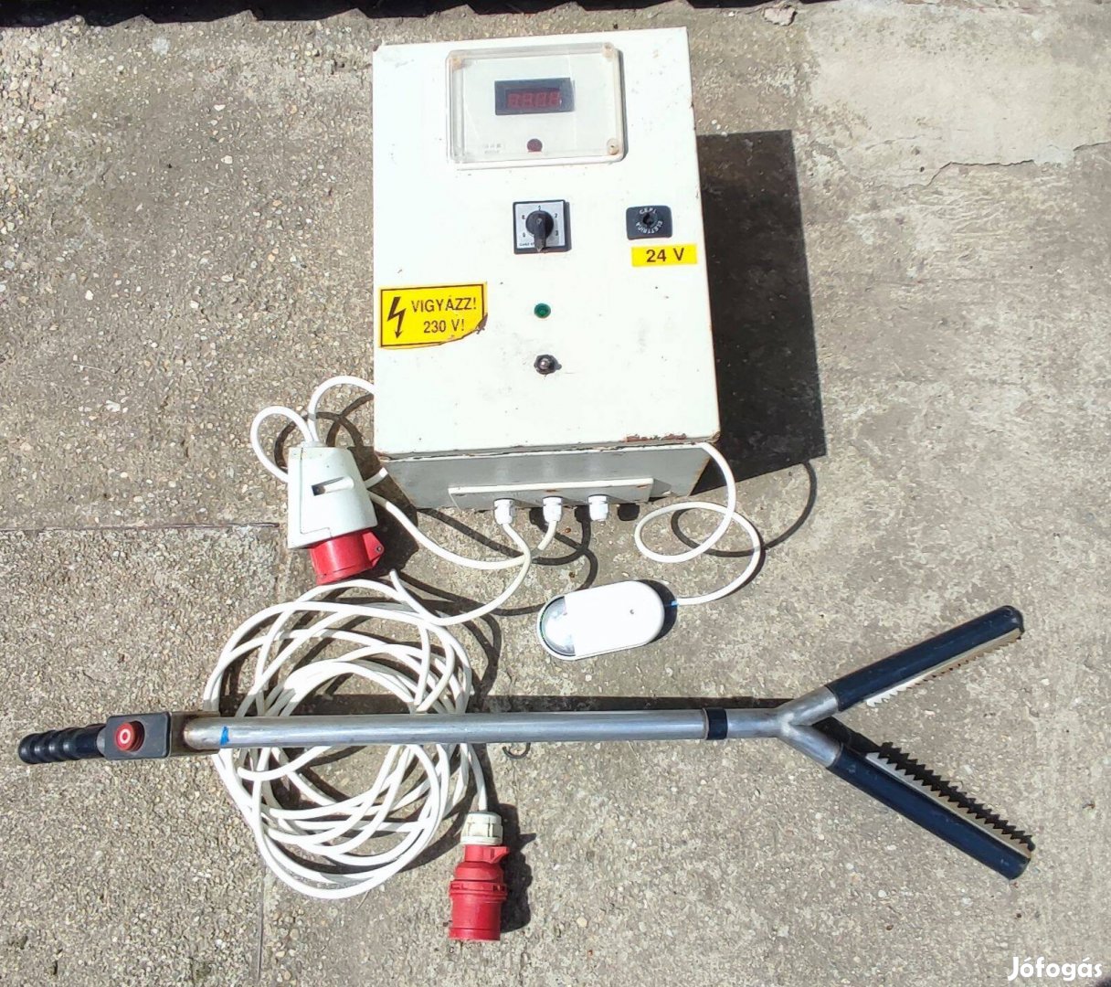 Eladó ipari kivitelű elektromos sertés kábító készülék, kábítófogóval együtt.