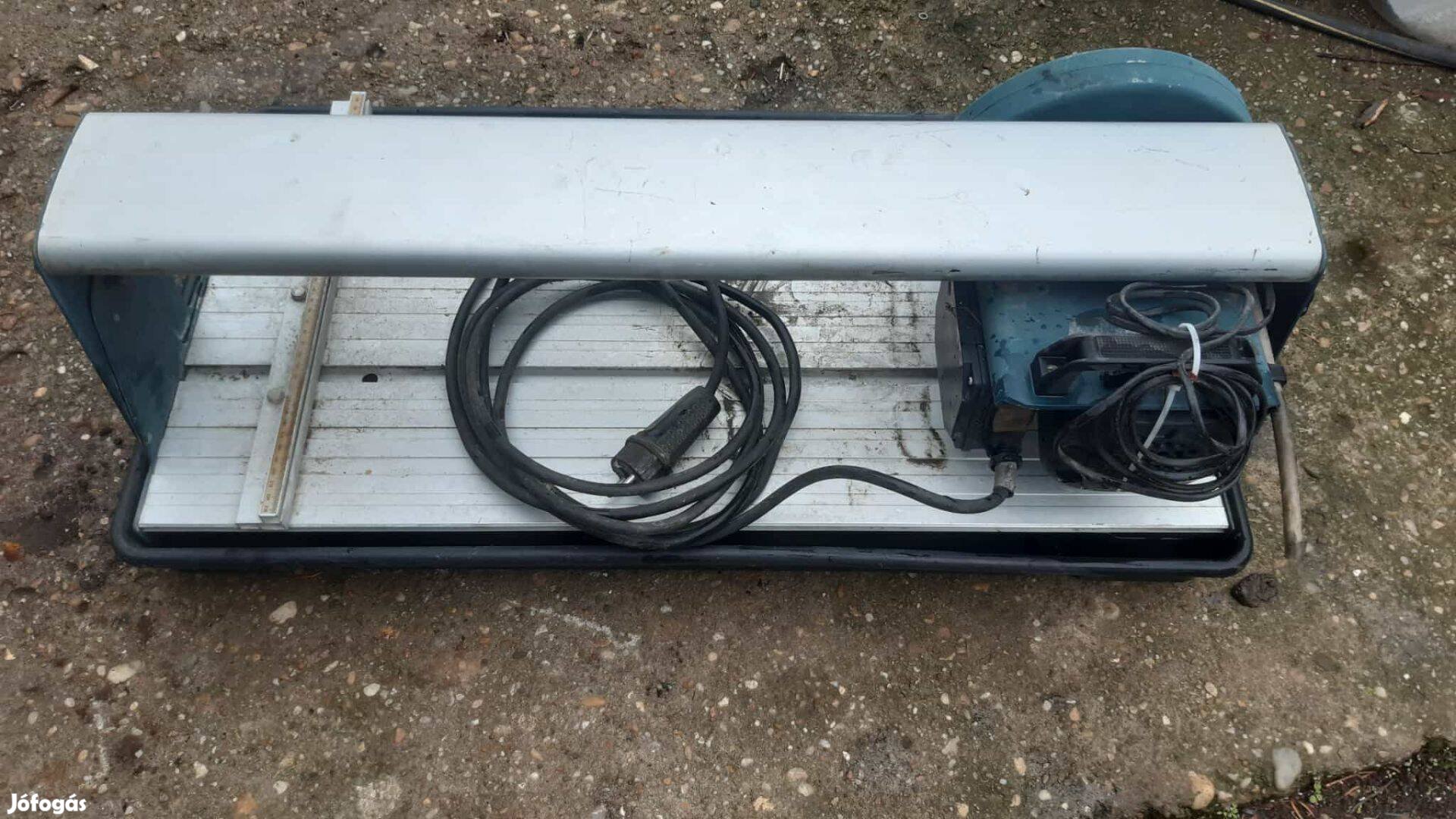 Sínes Csempevágó gép. Korongátmérő 210mm. A gép működik szépen, halkan dolgozik. Vízkenésű de vízszivattyú nincs benne, csak a kábelje van kihozva. Szögben állítható. Tudom küldeni is. 78x40 cm az asztal méret. Max tárgy magasság 7cm.