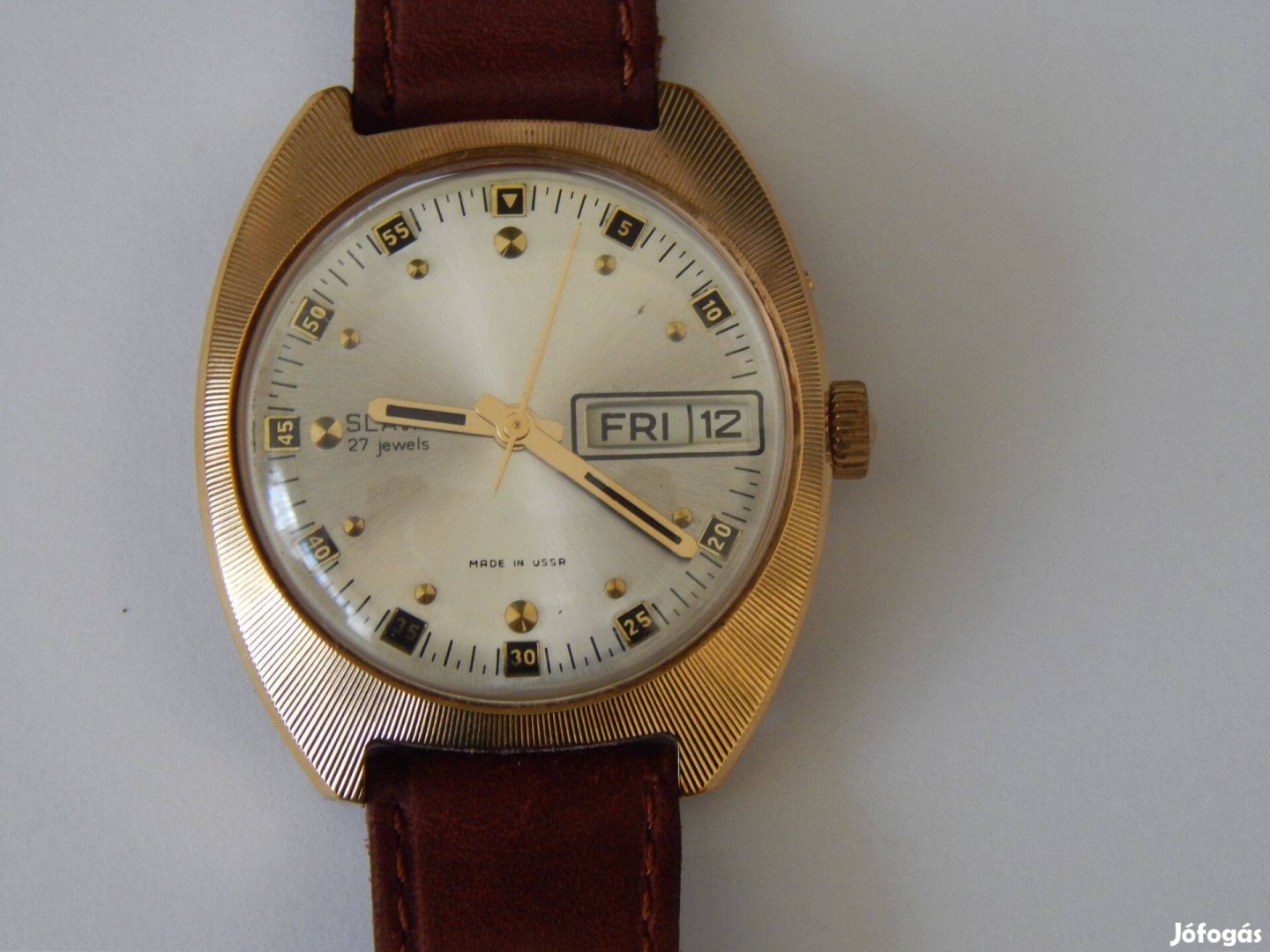 Nagyon jó állapotban lévő Szláva 27 köves automata eladó ! Gyönyörű állapotú aranyozott tok ,acél hátlap ,dupla naptár, gyors dátumváltás , tökéletes működés ! Átmérő :37 X 44 mm .