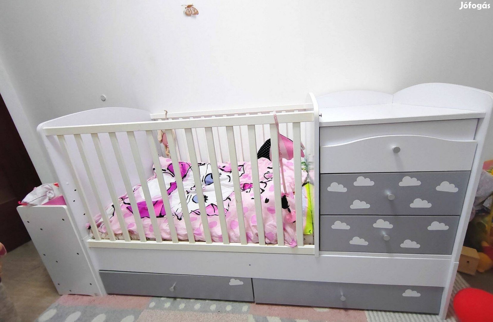 Szeretett kiságyunktól szeretnénk megvállni. Megkímélt, szép állapotú kombi maxi kiságy, több módon variálható. 2 kis esztétika hibája van ami fotók között jól láthatóak. Egyéb hibája nincs. Átalakítható ifjúsági ággyá, és több változatban is lehet használni. Így nagyon sokáig kihasználható, ágyráccsal plusz matraccal eladó. Matrac hideghabszivacs ami nem régiben lett vásárólva tisztítva van. A kiságy rácsos-babaágyként körülbelül 3 éves korig (max. 15 kg), junior gyermekágyként pedig körülbelül 12 éves korig használható. A gyerekágy az oldalrácsok és a pelenkázószekrény eltávolítása után egy ifjúsági heverővé és egy éjjeli szekrénnyé alakítható. Az ágy könnyedén átalakítható, amihez nincs szükség pótalkatrészek vásárlására, ezek a termékkel együtt járnak.