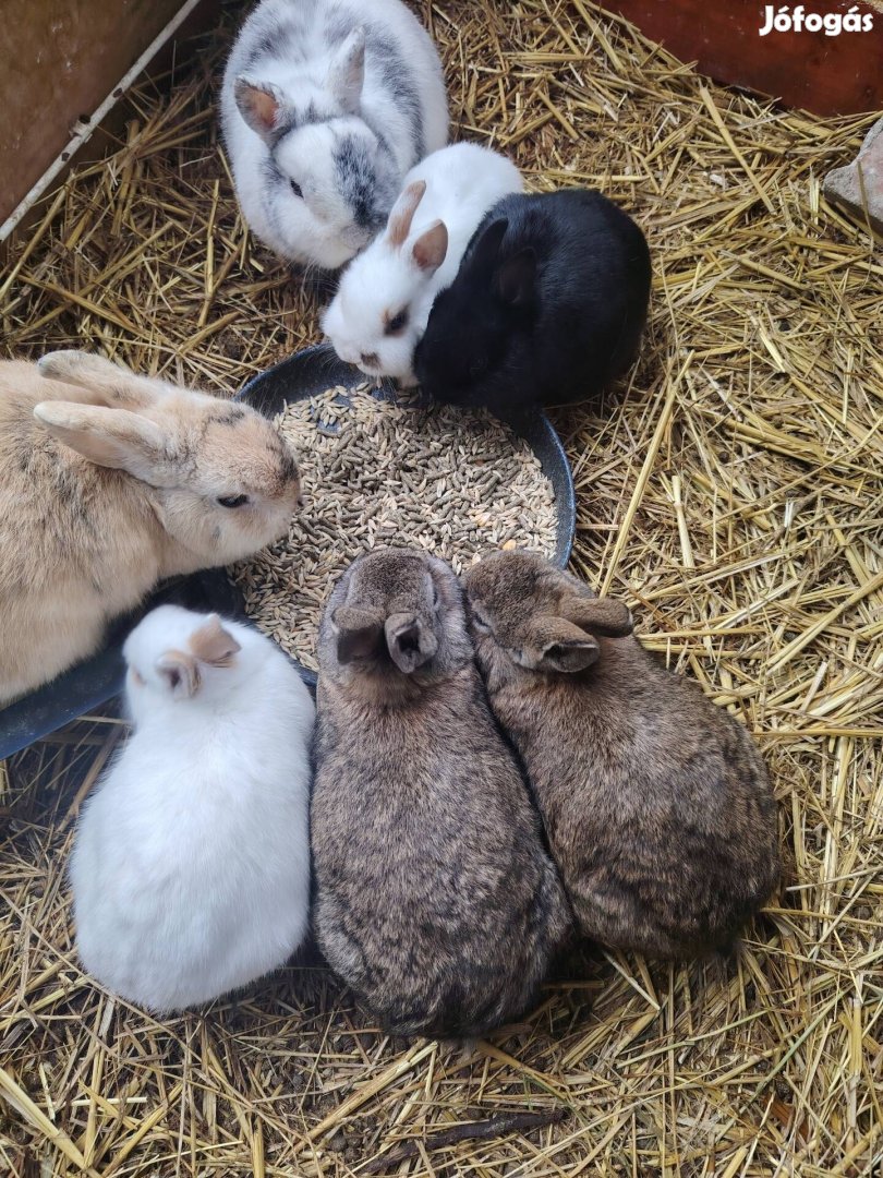 Törpe nyuszi 2 fehér tarka, 2 vadas, 1 fekete , Berettyóújfalu