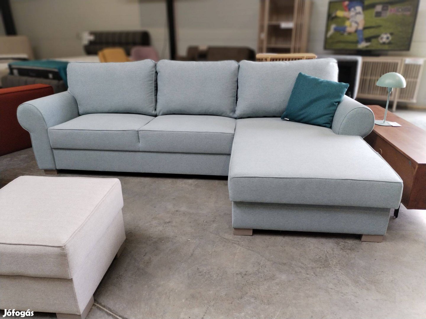 Új, babakék szövet "L" kanapé. Ágyazható, nagy fekvőfelülettel és ágyneműtartóval eladó.