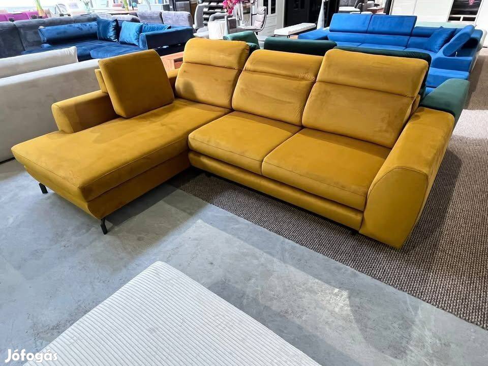 Új, okkersárga bársony anyagú, ágyazható-ágyneműtartós, állítható fejtámlás L kanapé.