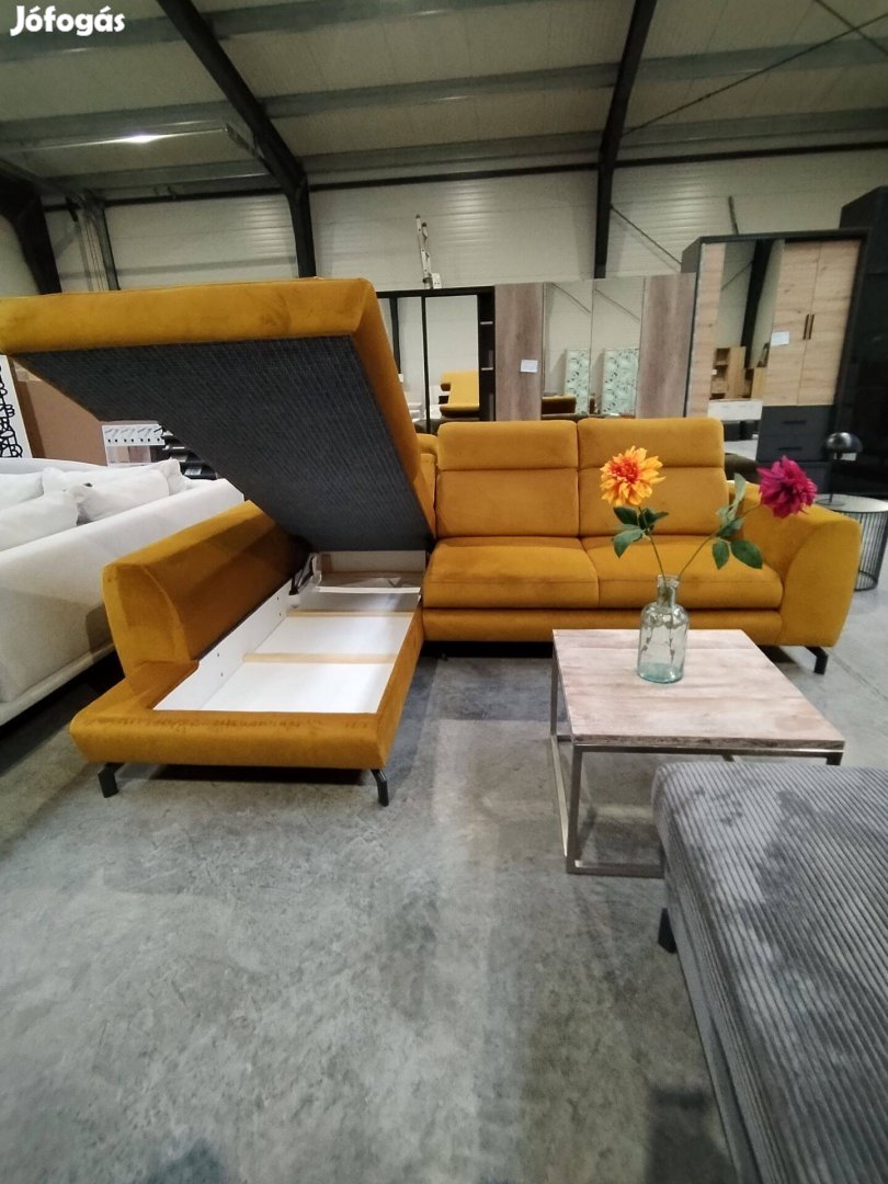 Új, okkersárga sarokkanapé, ágyazható, ágyneműtartós!