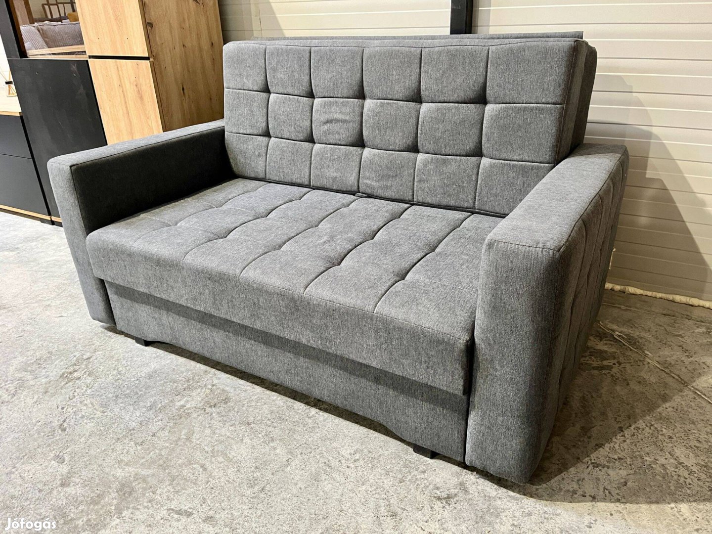 Új, szürke színű szövet kis kanapé, ágyazható - ágyneműtartós funkcióval.