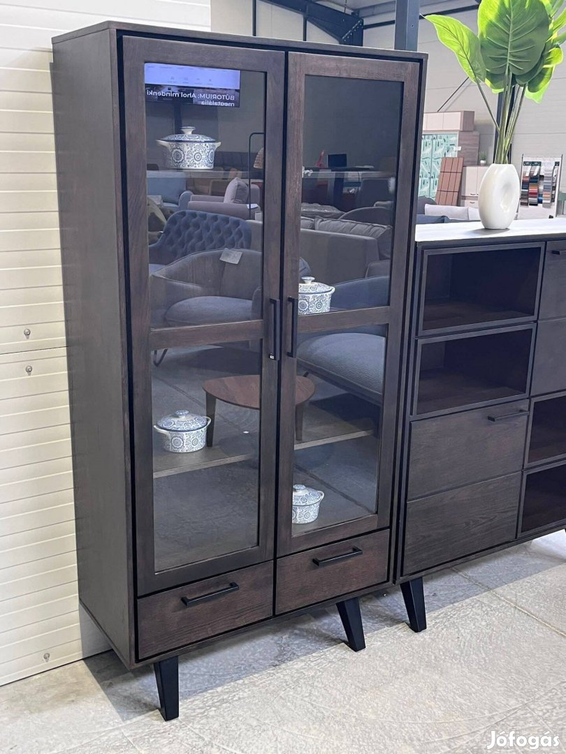 Új, valódi tömör tölgyfa dupla ajtós üveges vitrin és hozzá tartozó tálaló szekrény-komód, smoked páccal, fekete fém lábakkal.
